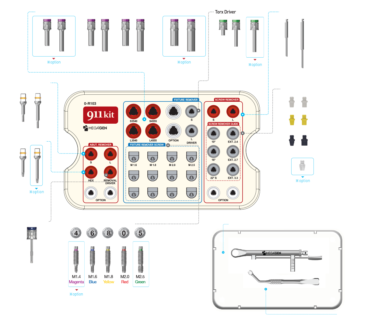 The MegaGen 911 Kit is a comprehensive implant rescue solution designed to help clinicians safely and efficiently remove broken or fractured implant components — including fixtures, abutments, and screws — with a complete toolkit tailored for difficult extraction scenarios.